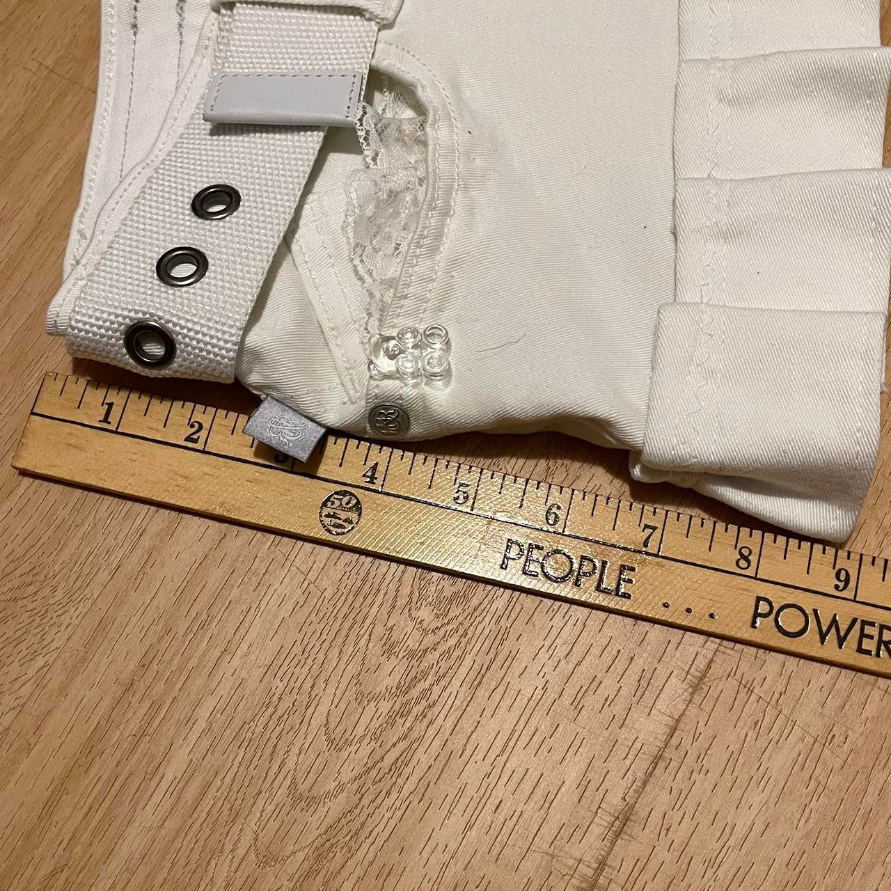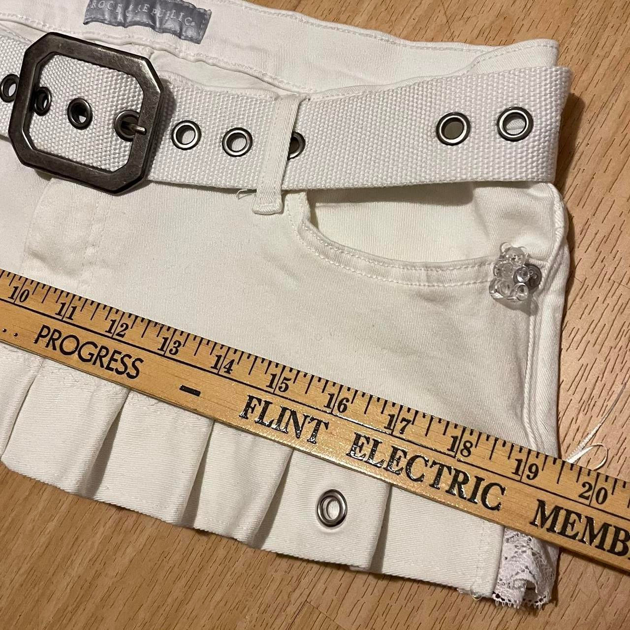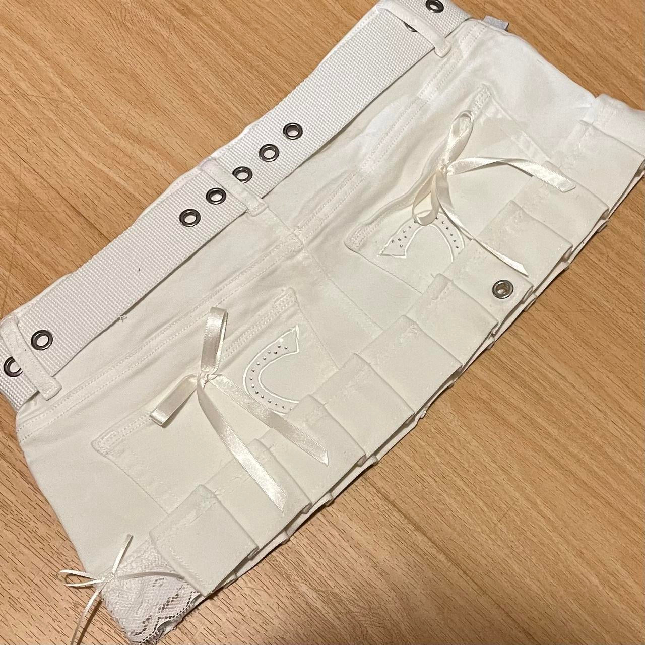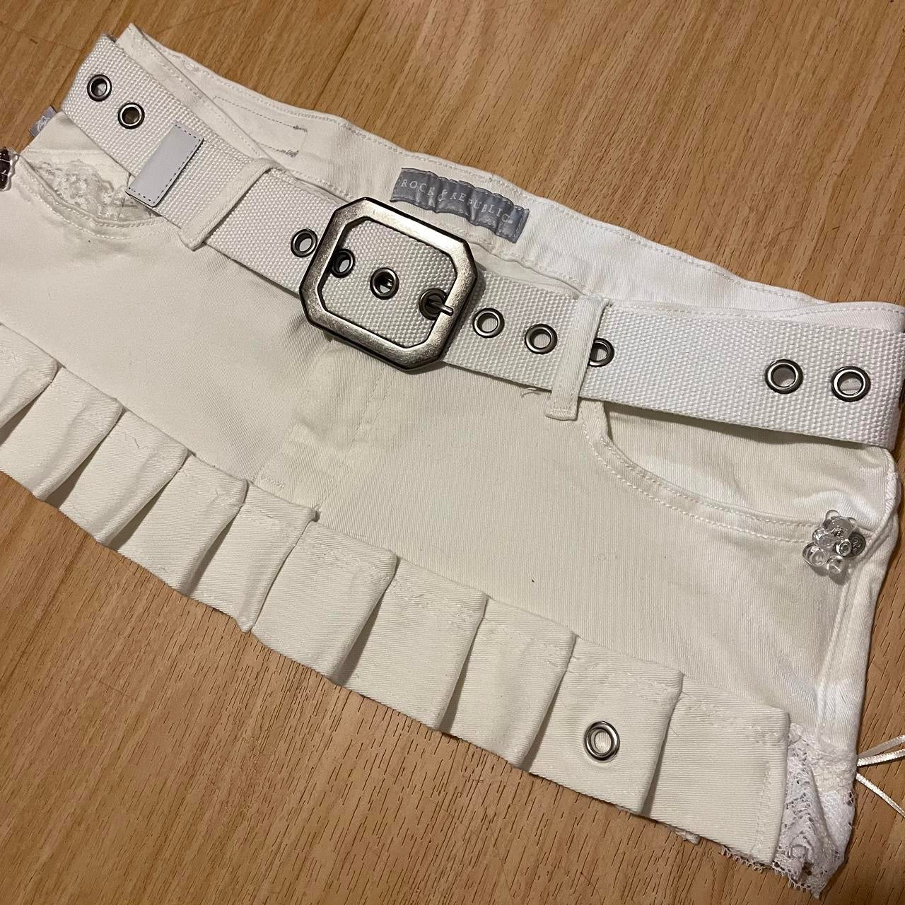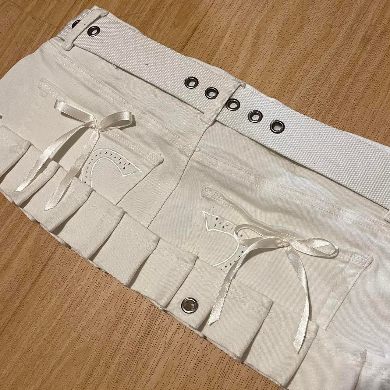 ୨୧ reworked ooak 2000s snow angel princess extreme denim micro mini skirt with ice clear teddy charms, lace trim, rhinestones, y2k grommet belt , & white bows