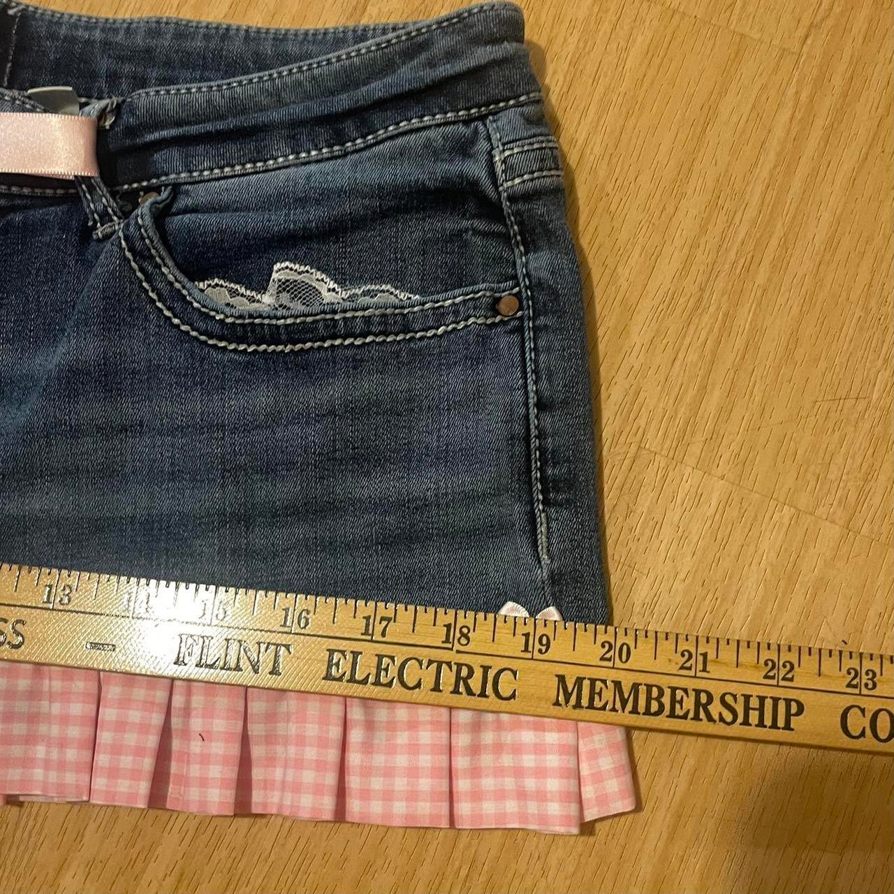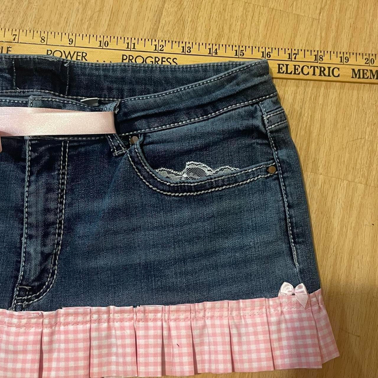 ୨୧ reworked OOAK vintage 2000s pinkaholic princess micro mini denim skirt with lace, charms, baby pink gingham trim and baby pink bows