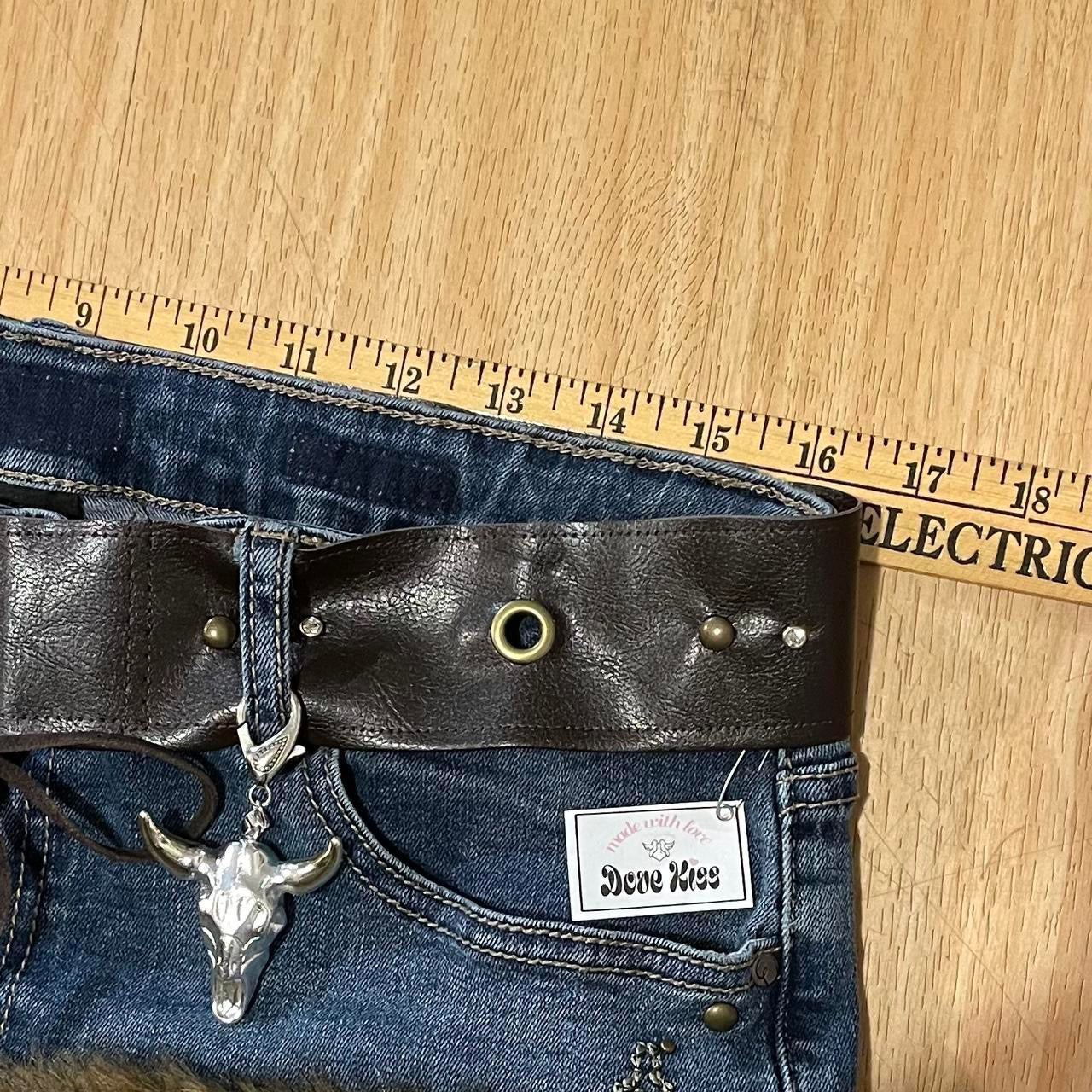 ~ approx. 32.5” low waist (slightly adjustable due to belt )