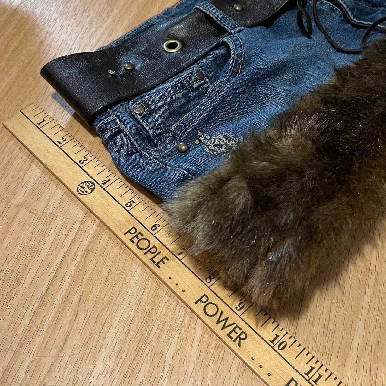Comes with handmade faux leather waist tie belt, bull charm, contrast stitching, striped brown faux fur & studs