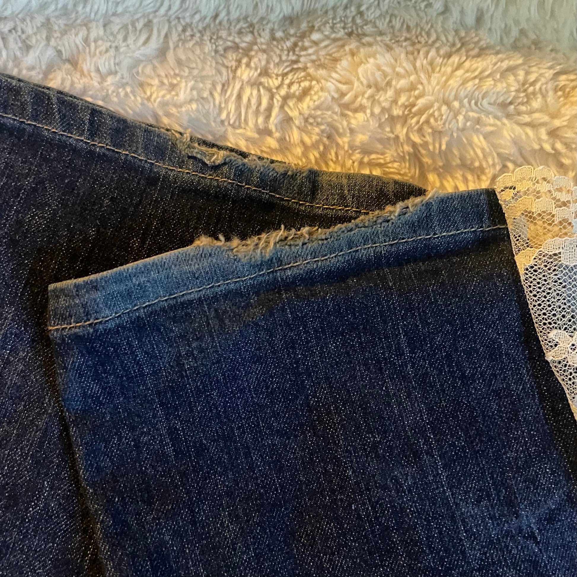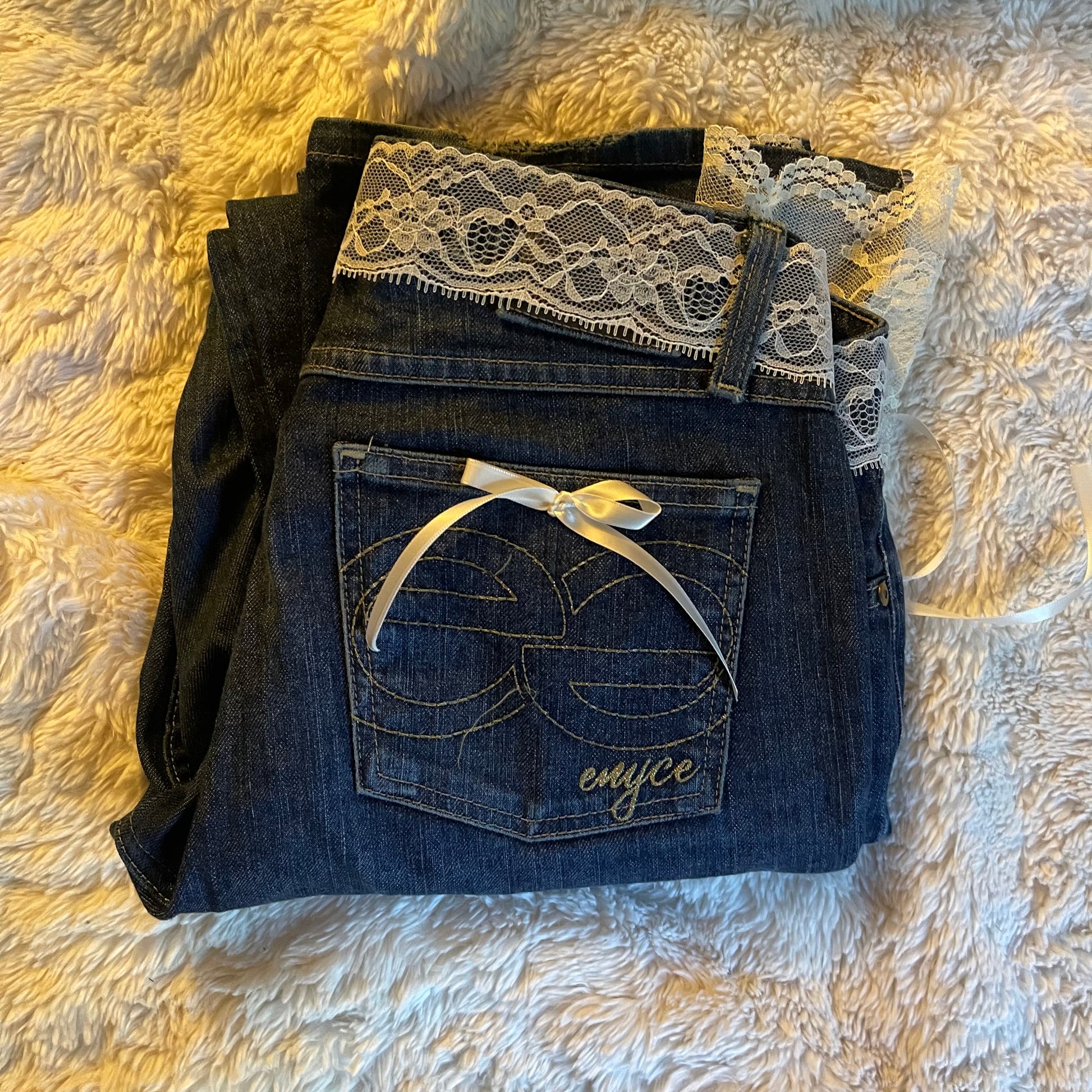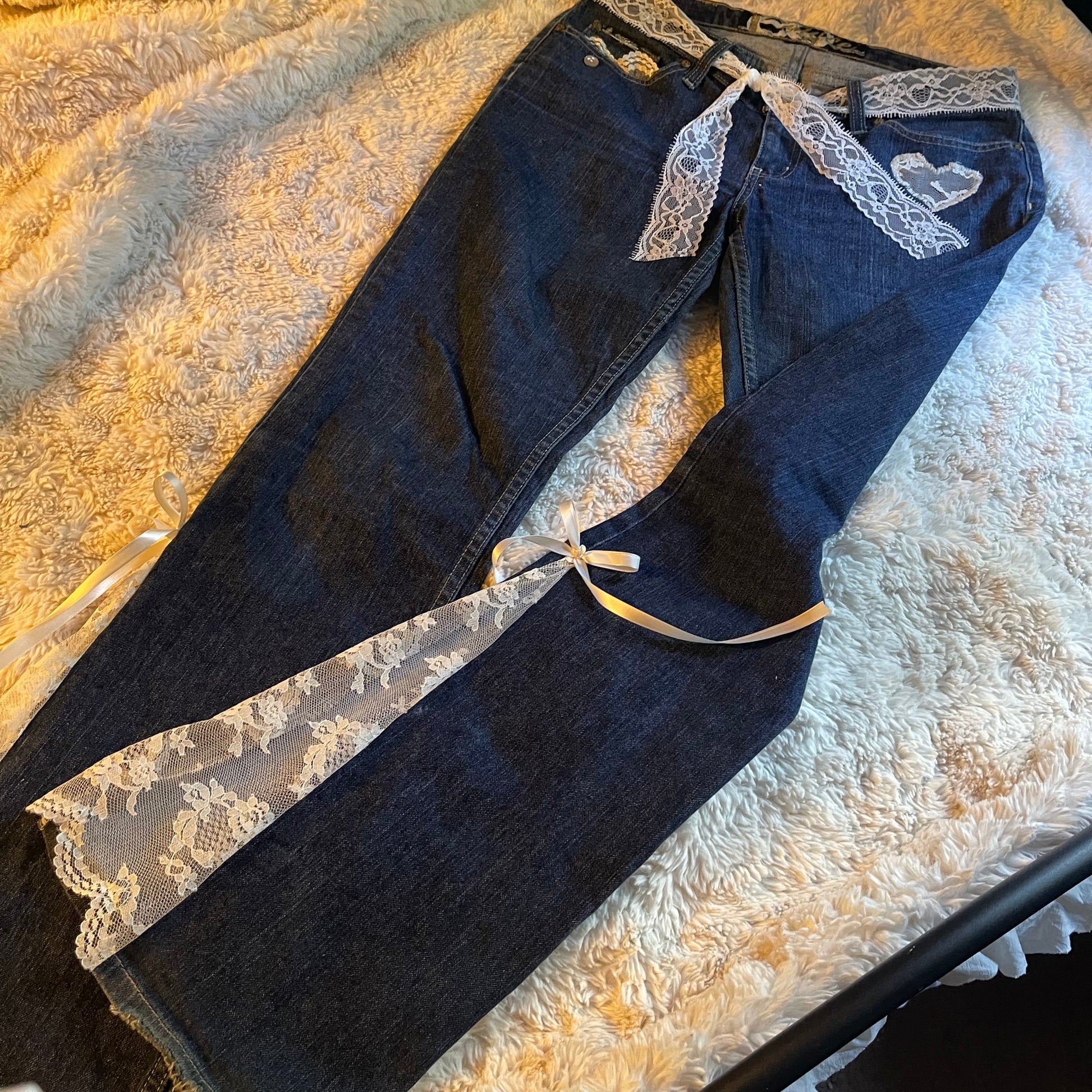 ୨୧ reworked y2k princess OOAK white ribbon flare jeans with contrast stitching, heart patch, lace panels + bows