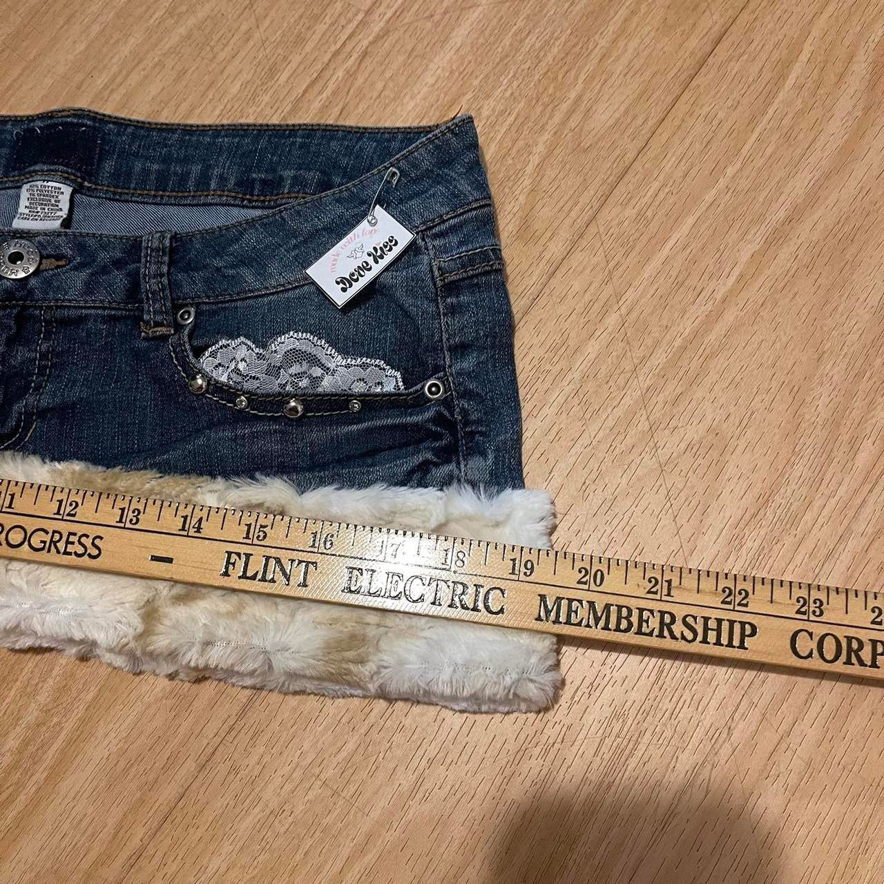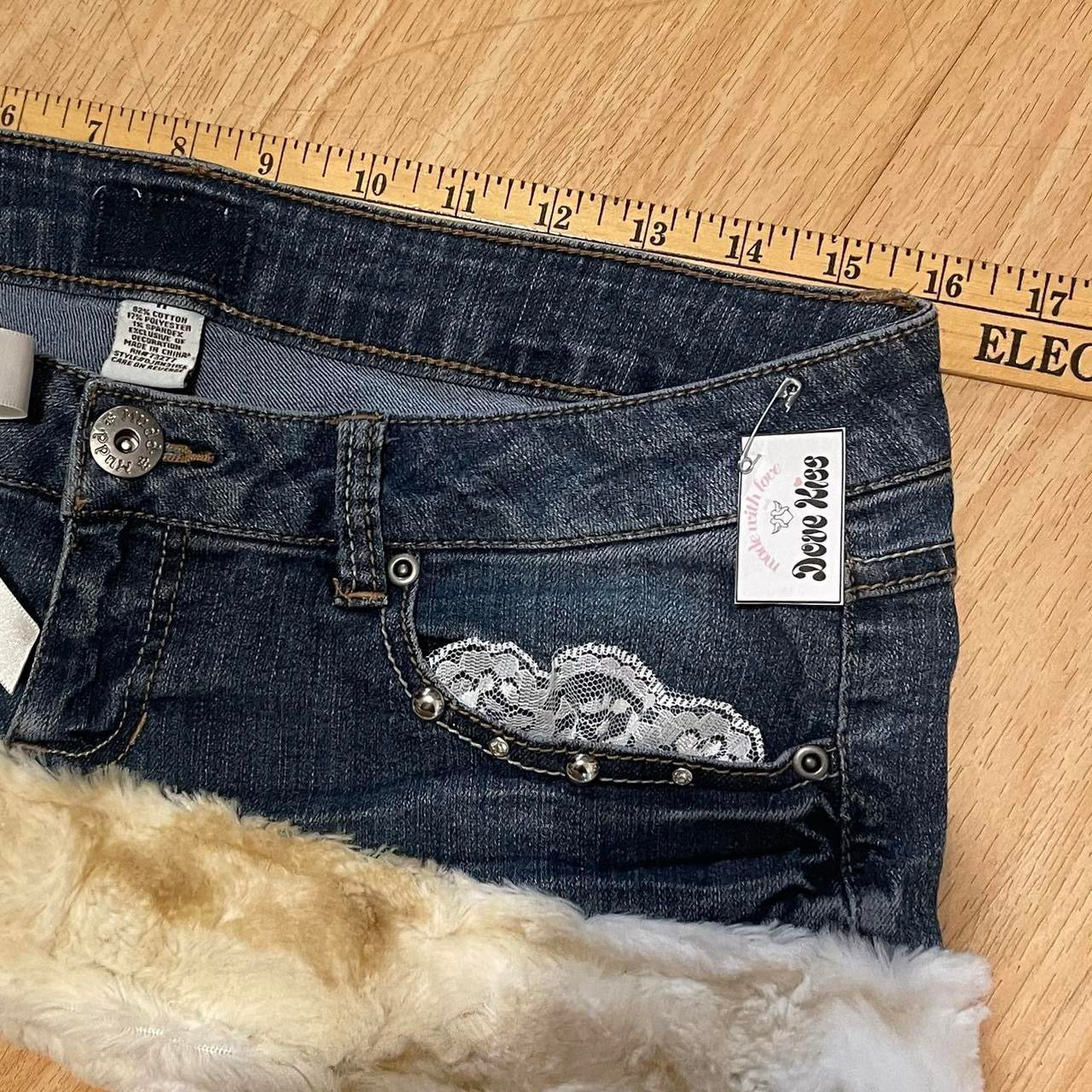 reworked OOAK 2000s angel princess micro mini fur trim skirt with partial inner fur lining, studs, rhinestones, lace, & ribbons ୨୧