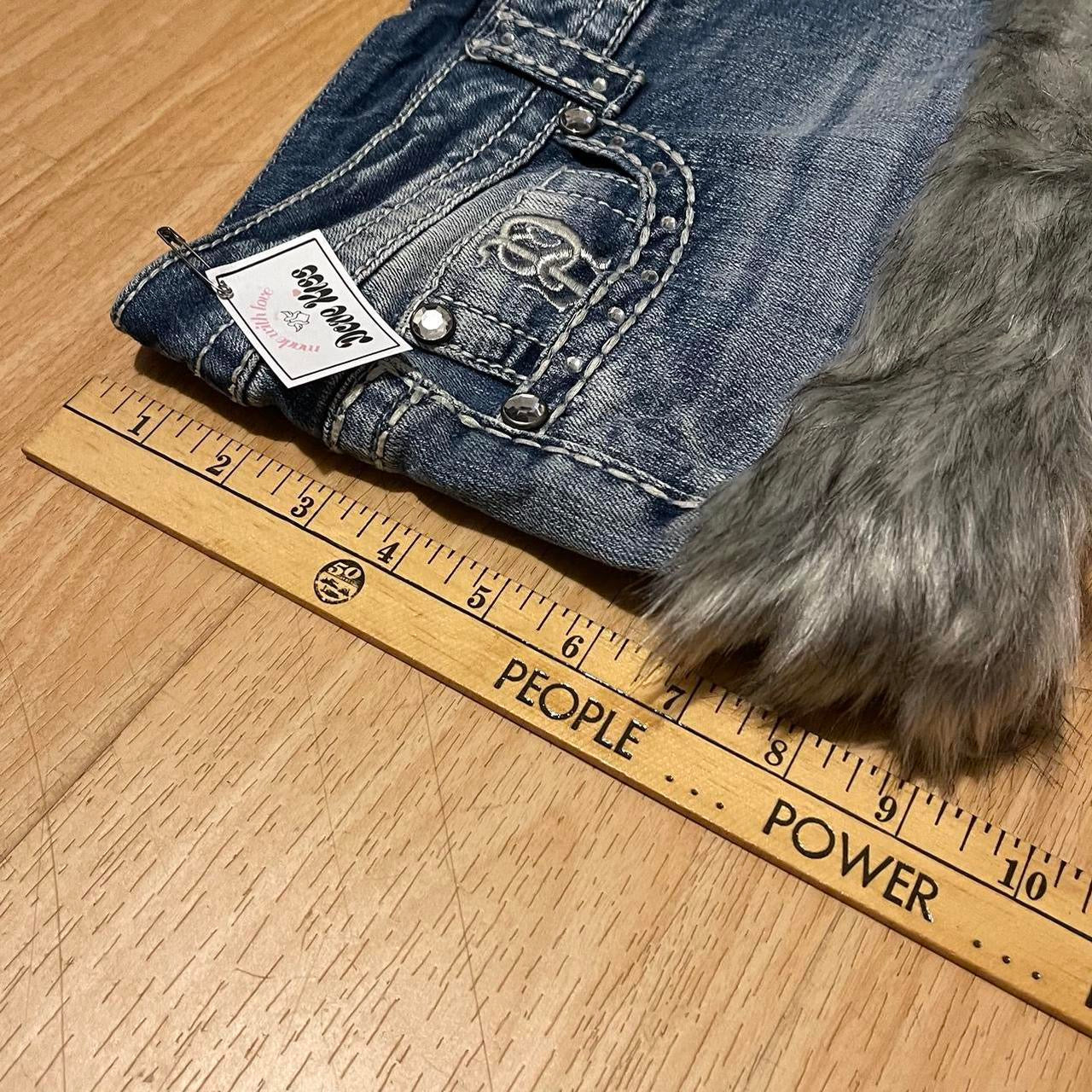 with rhinestones, contrast stitching, grey wolf faux fur + partial fur lining, rhinestone key charm & ribbons